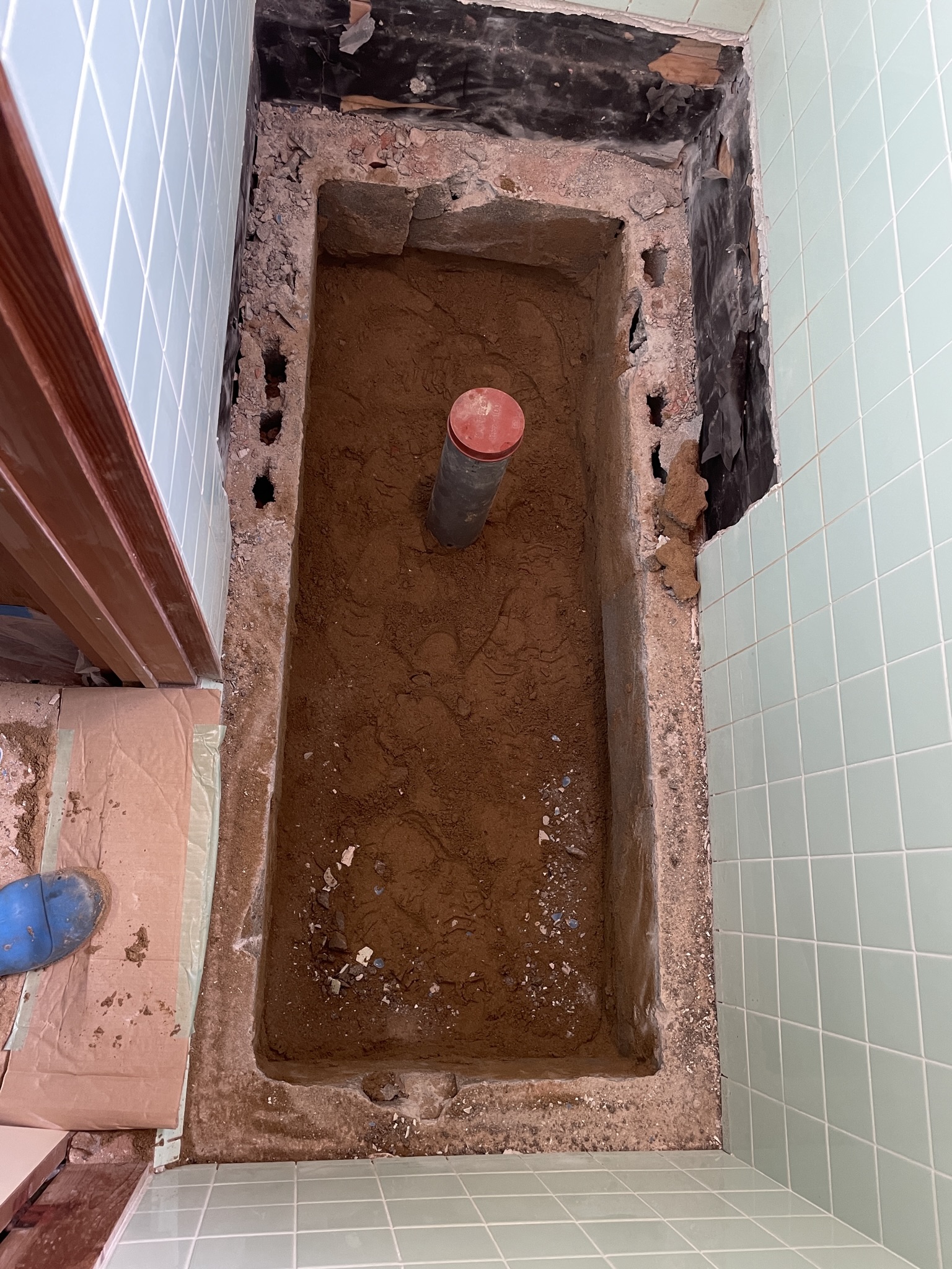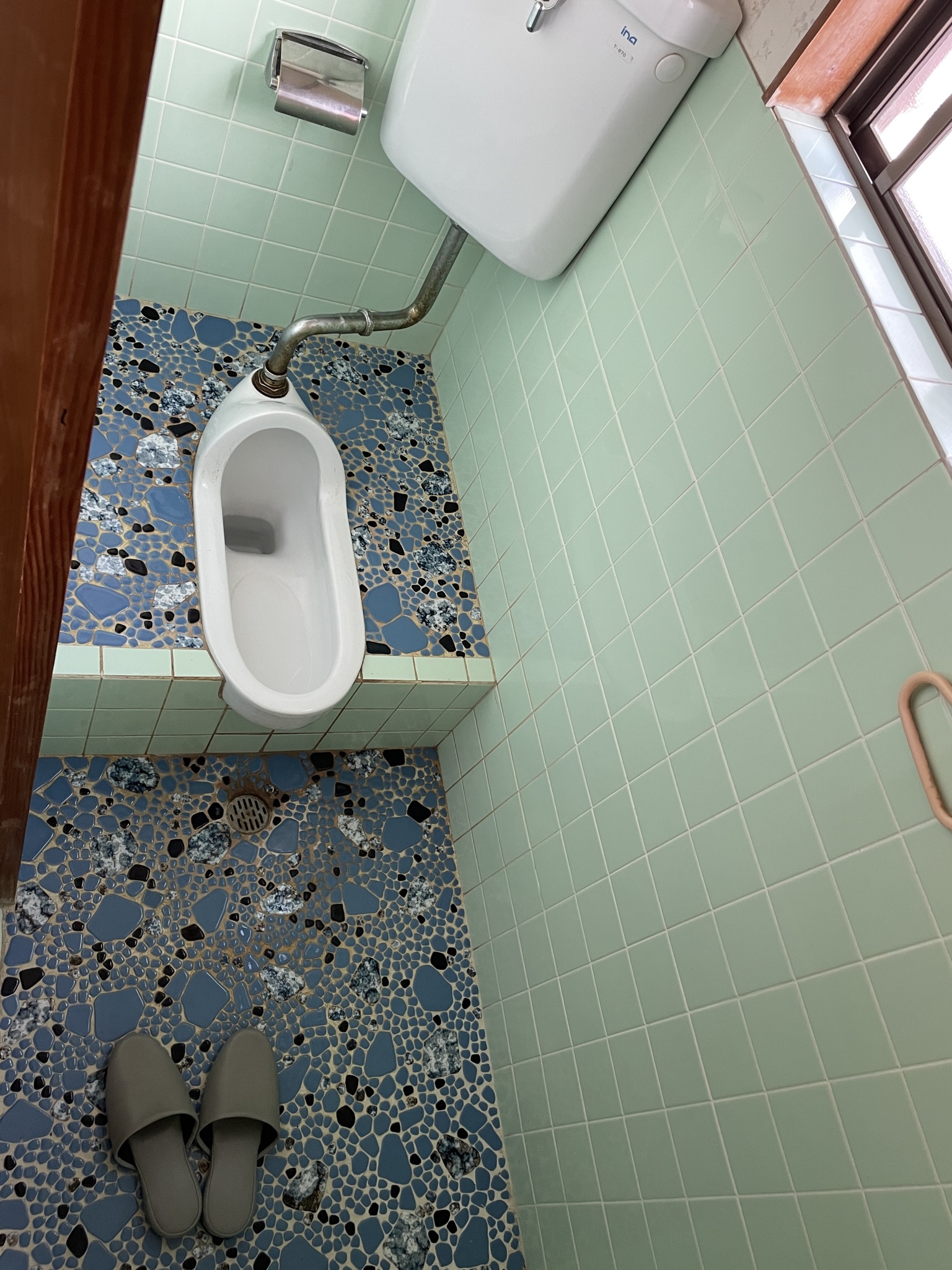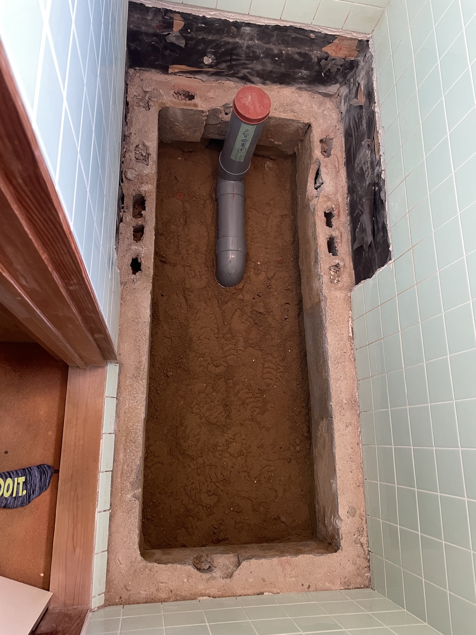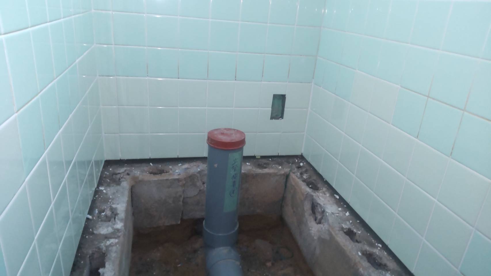 便器を撤去して床を取り壊します。 今回は兼用便器タイプだった為、壁タイルの一部も撤去です。