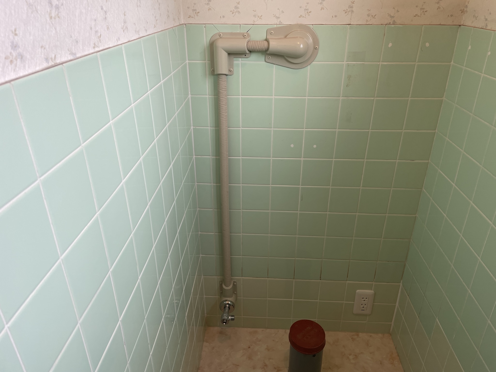 壁のタイルを復旧します。 タイルの色は既設に似たような色にて施工。 ※既設タイルはすでに廃番で同じ色はないため、類似色タイルにて。