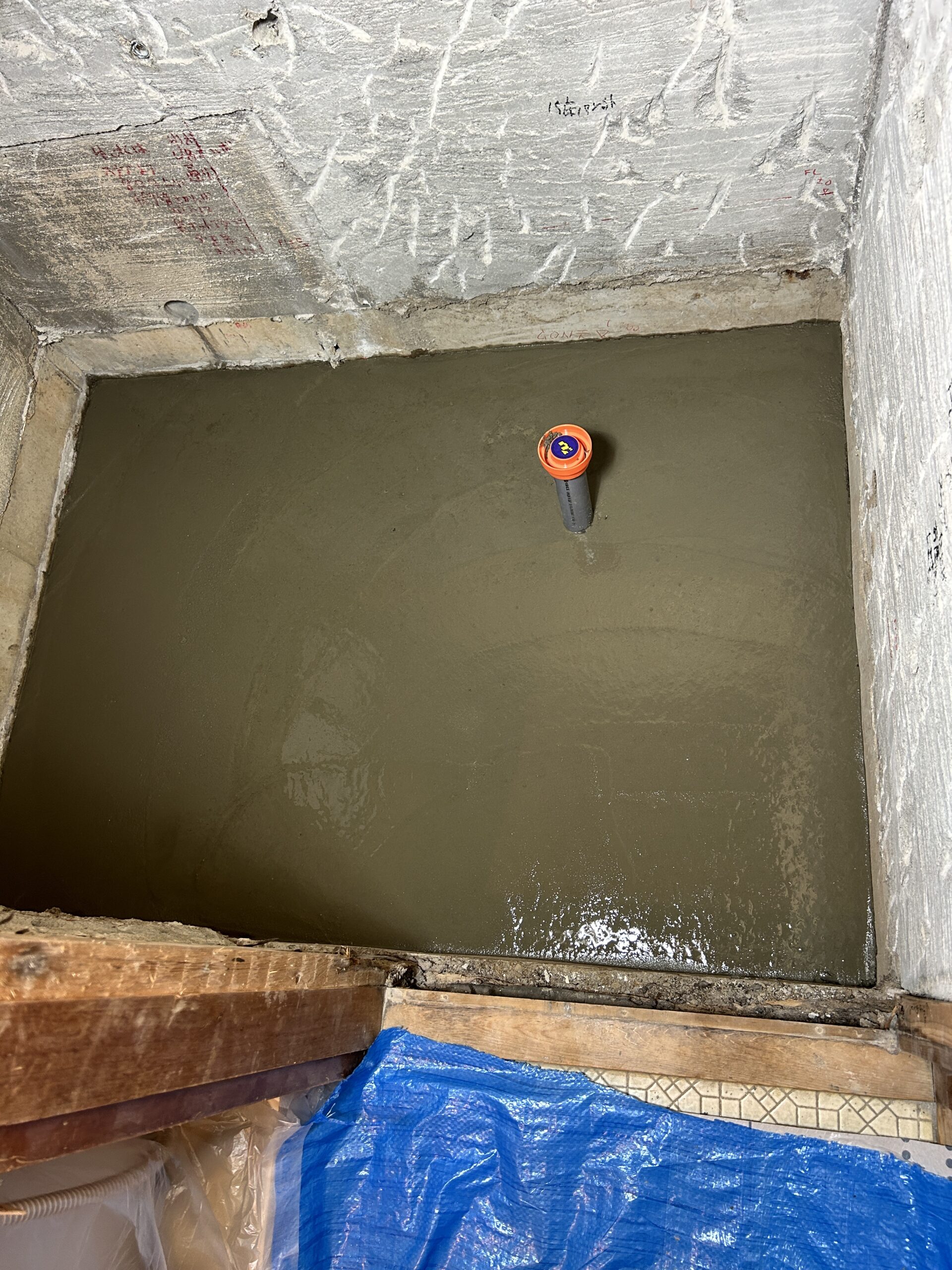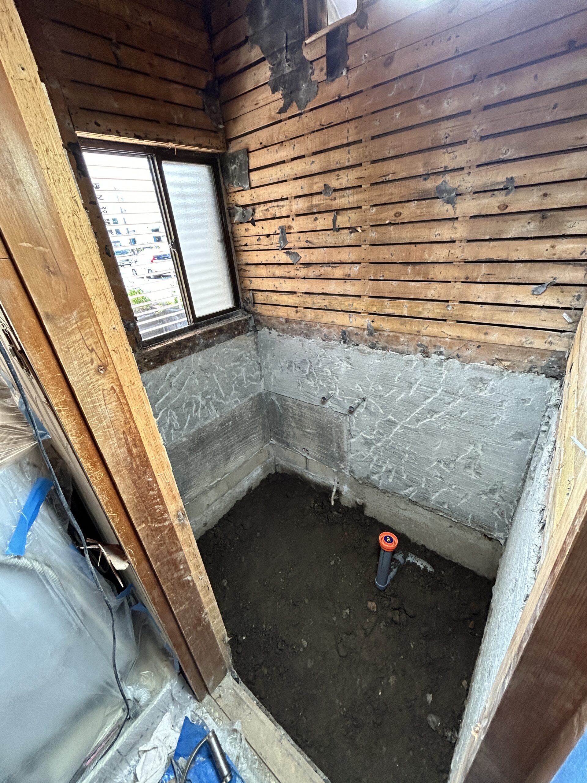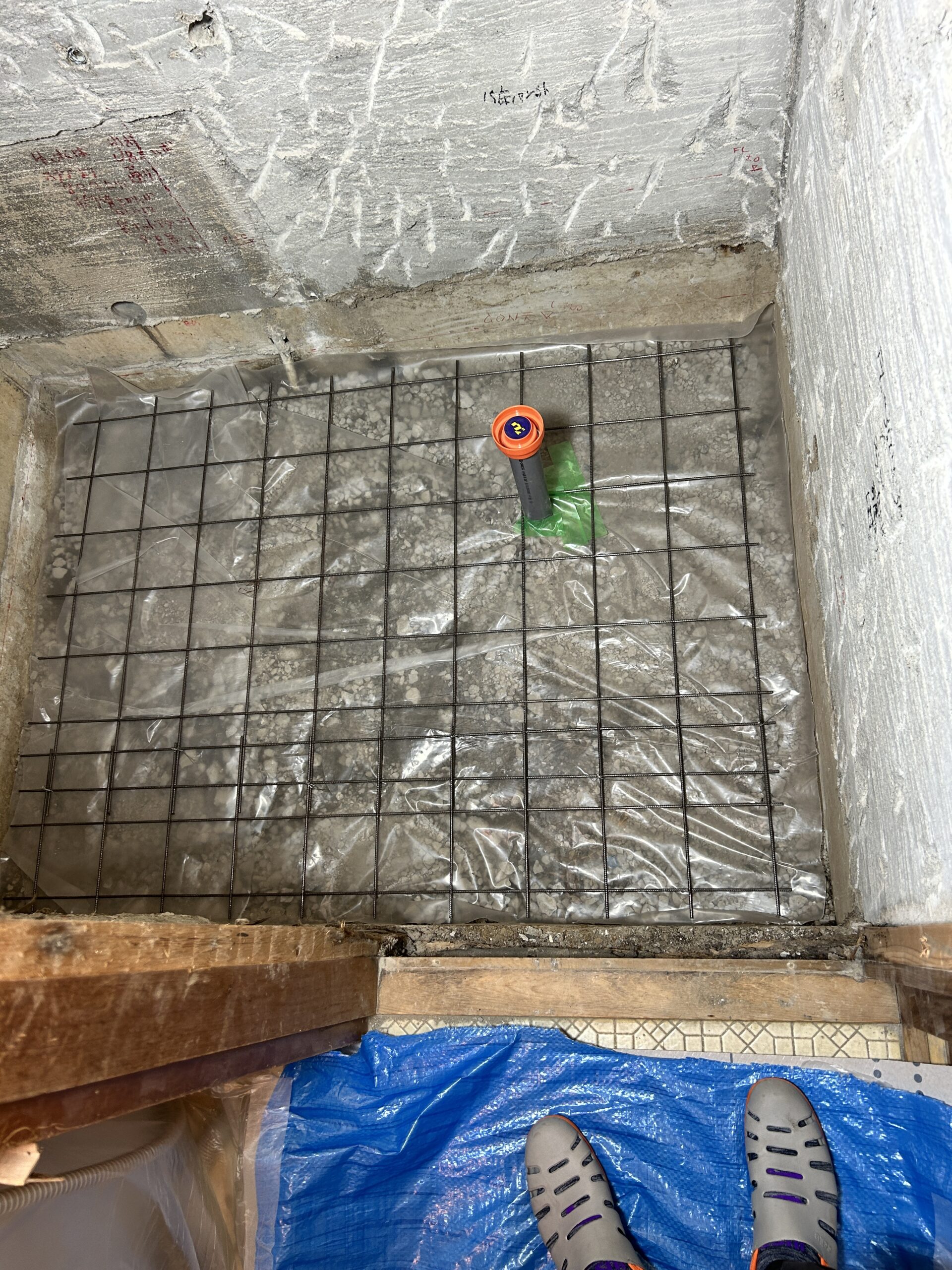 ユニットバス設置用に基礎コンクリートを打設します。防湿シート&メッシュ筋を敷設。