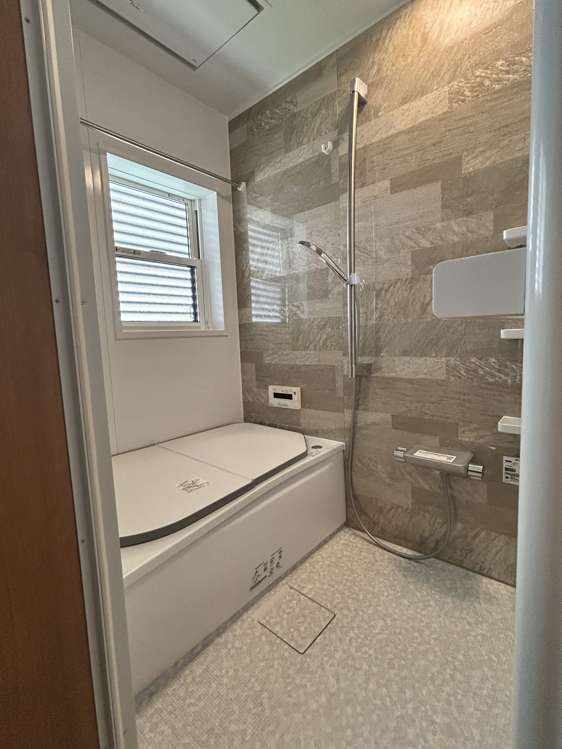 ユニットバスの設置完了!TOTO サザナ というユニットバスを採用致しました。 冬も寒くないように暖房換気扇(三乾王)を設置。また、窓も既設の一重サッシをカバー工法にて二重サッシに取替。 冬も快適にお風呂に入っていただけます♪