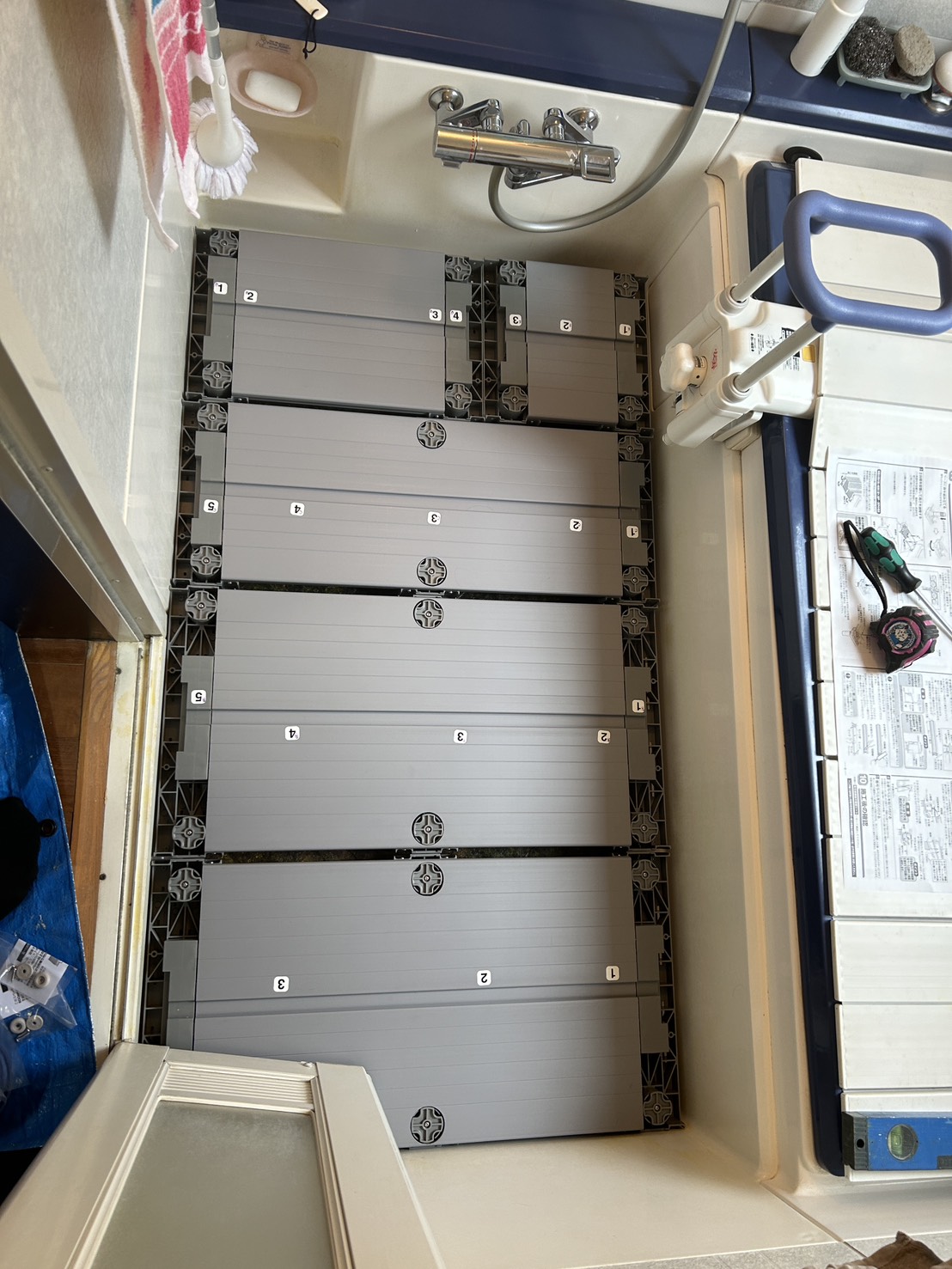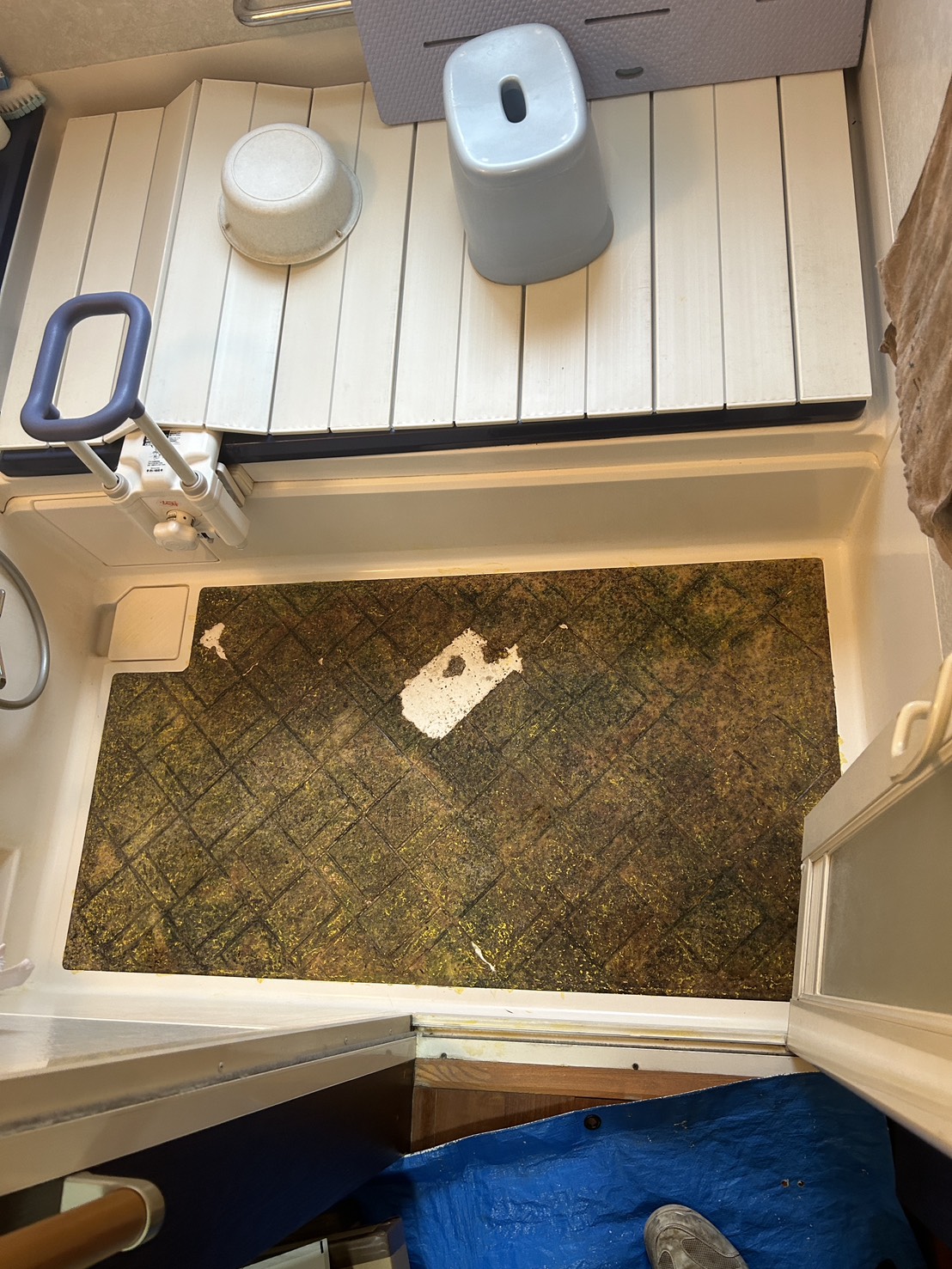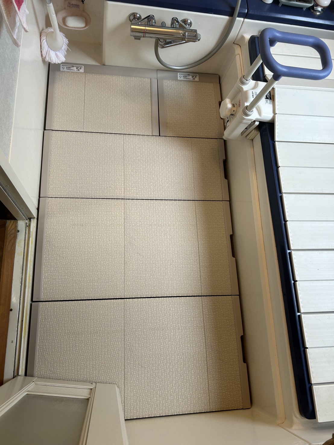 採用したものはTOTOの浴室すのこ です。 こちらは介護保険適用品です。 パーツを組み合わせて置いていくだけなので大掛かりな工事の必要もなく、また、既設の床のメンテナンスも、すのこを上げれば可能なので、良い商品だと思います。