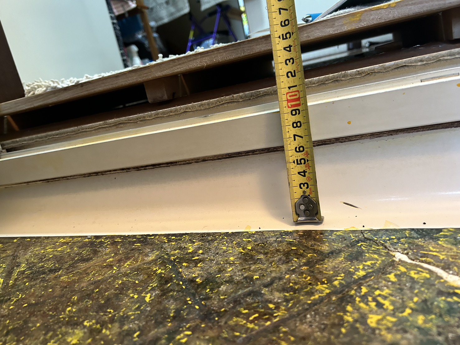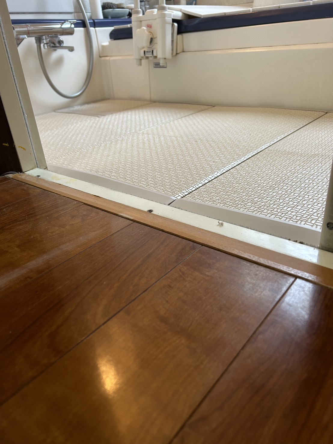 洗い場と脱衣場の段差は約15cm。この段差は健常者や若者はなんてことない段差ですが、足が悪い方や高齢者の方にとっては、転倒や躓きの原因となる危険な段差です。 ※今回のお客様は、足が悪くご高齢な為、段差をなくす事が重要と感じました。