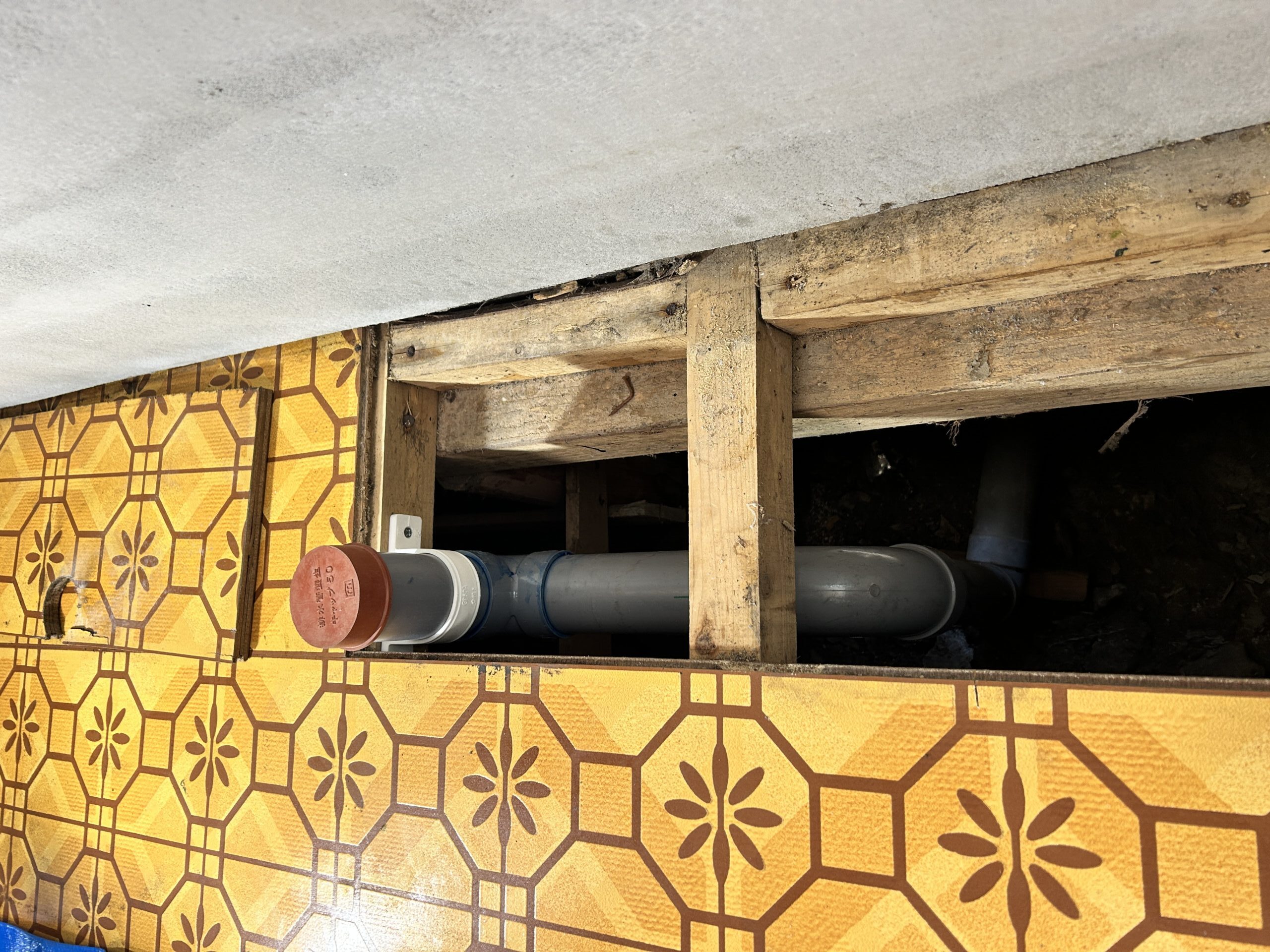 排水管の位置を変更! 排水管は床下かつ流し台の下になる為、勾配確認と配管の固定はしっかりと行います。