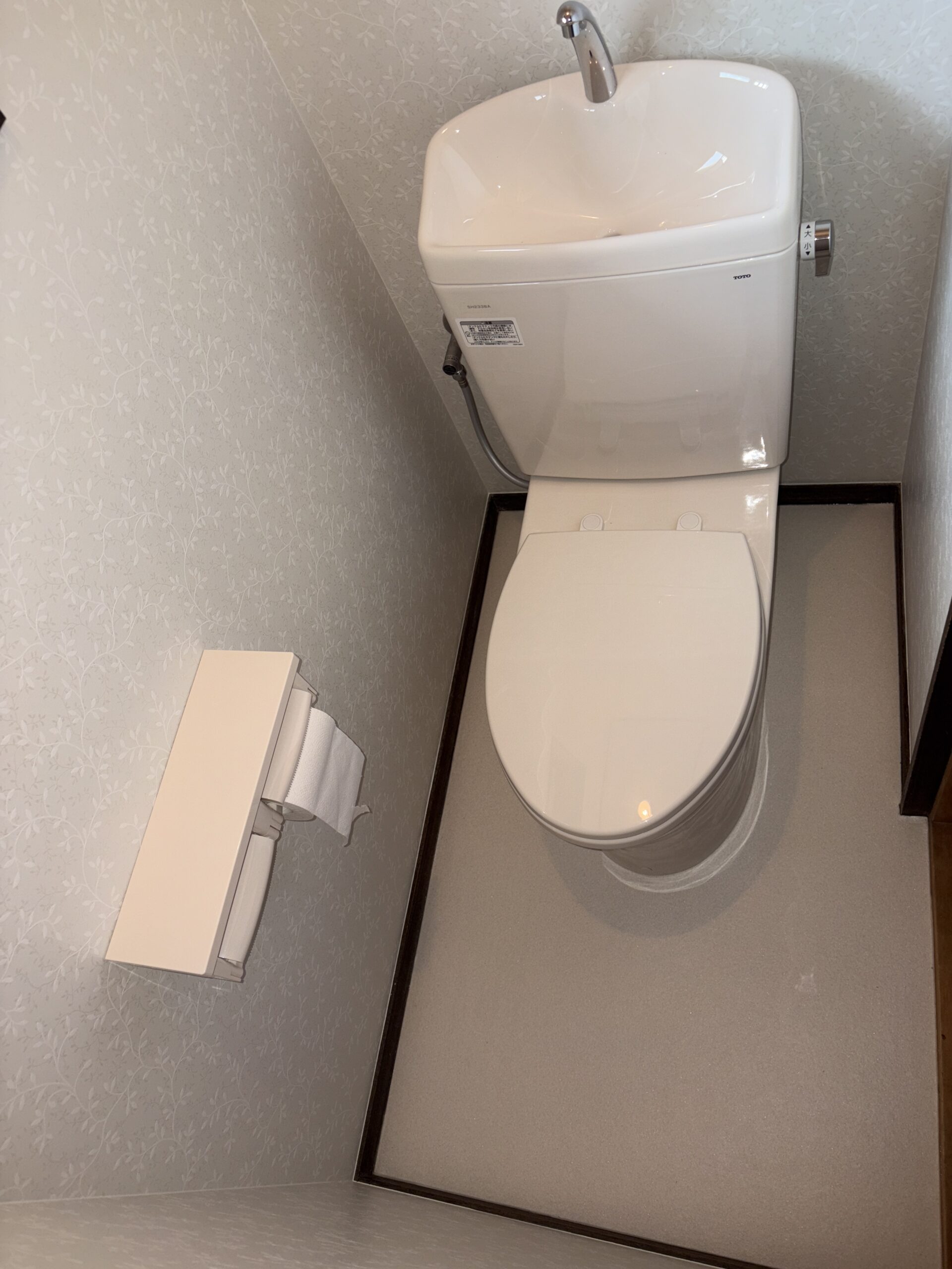 便器を設置して完了です♪ 落ち着いた感じのトイレとなりました♪ 壁クロスには蔦の模様が入っていますが、良いアクセントになっていて良い空間になりました♪