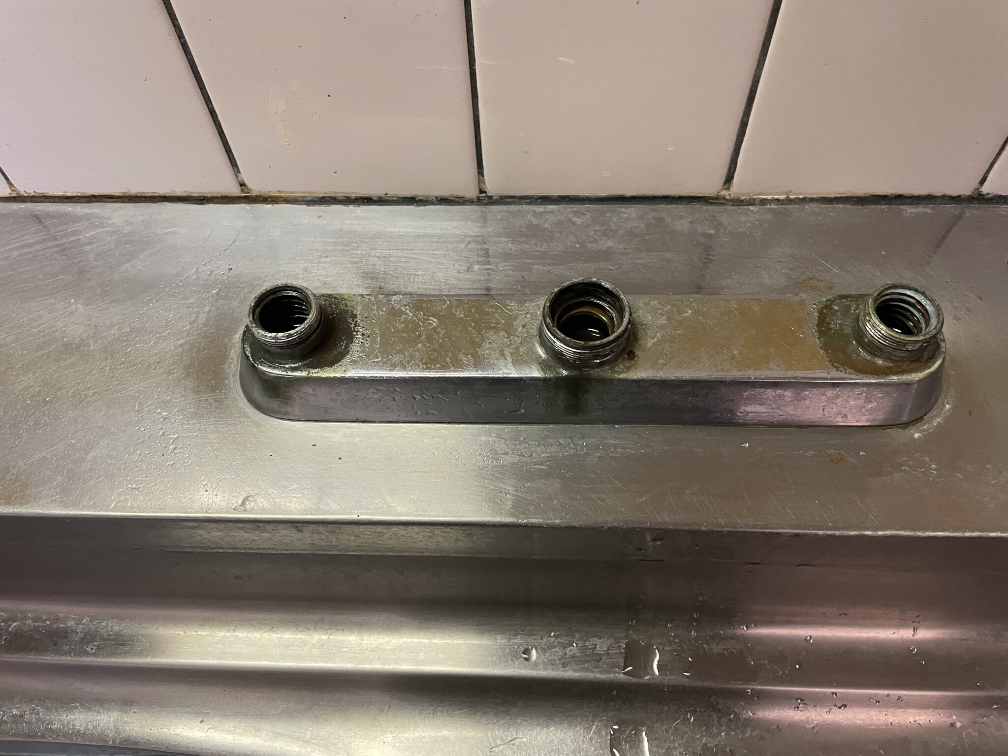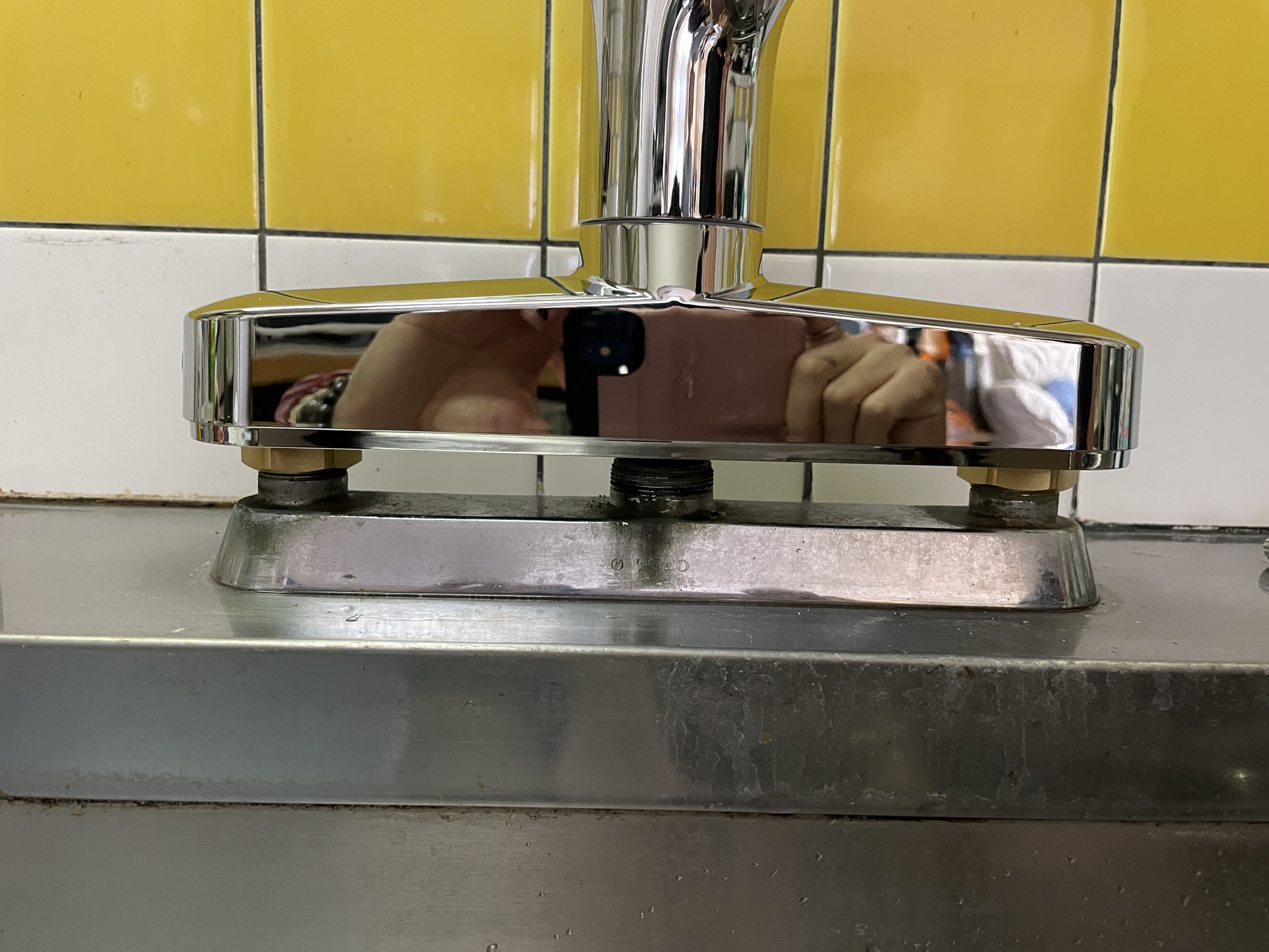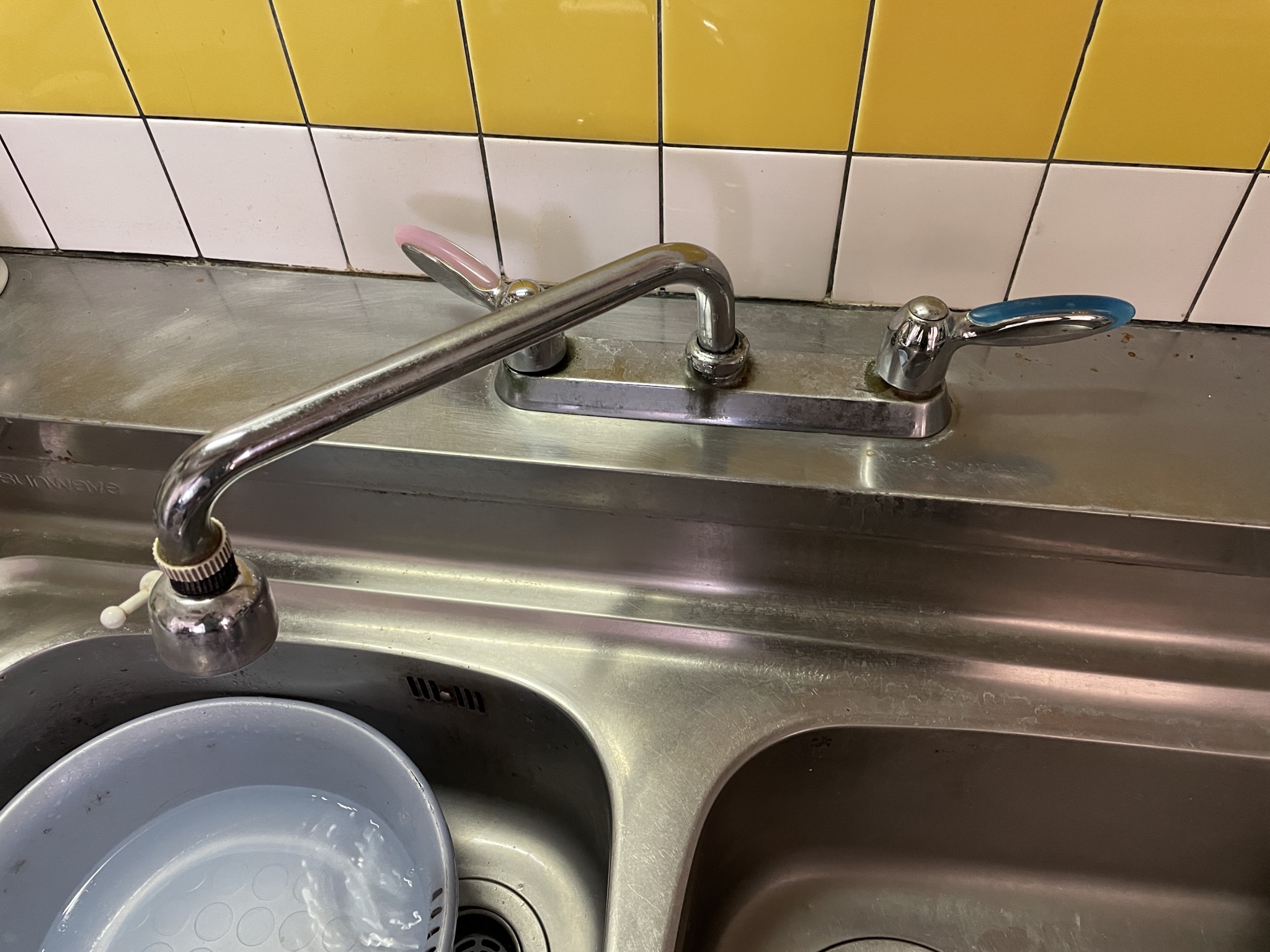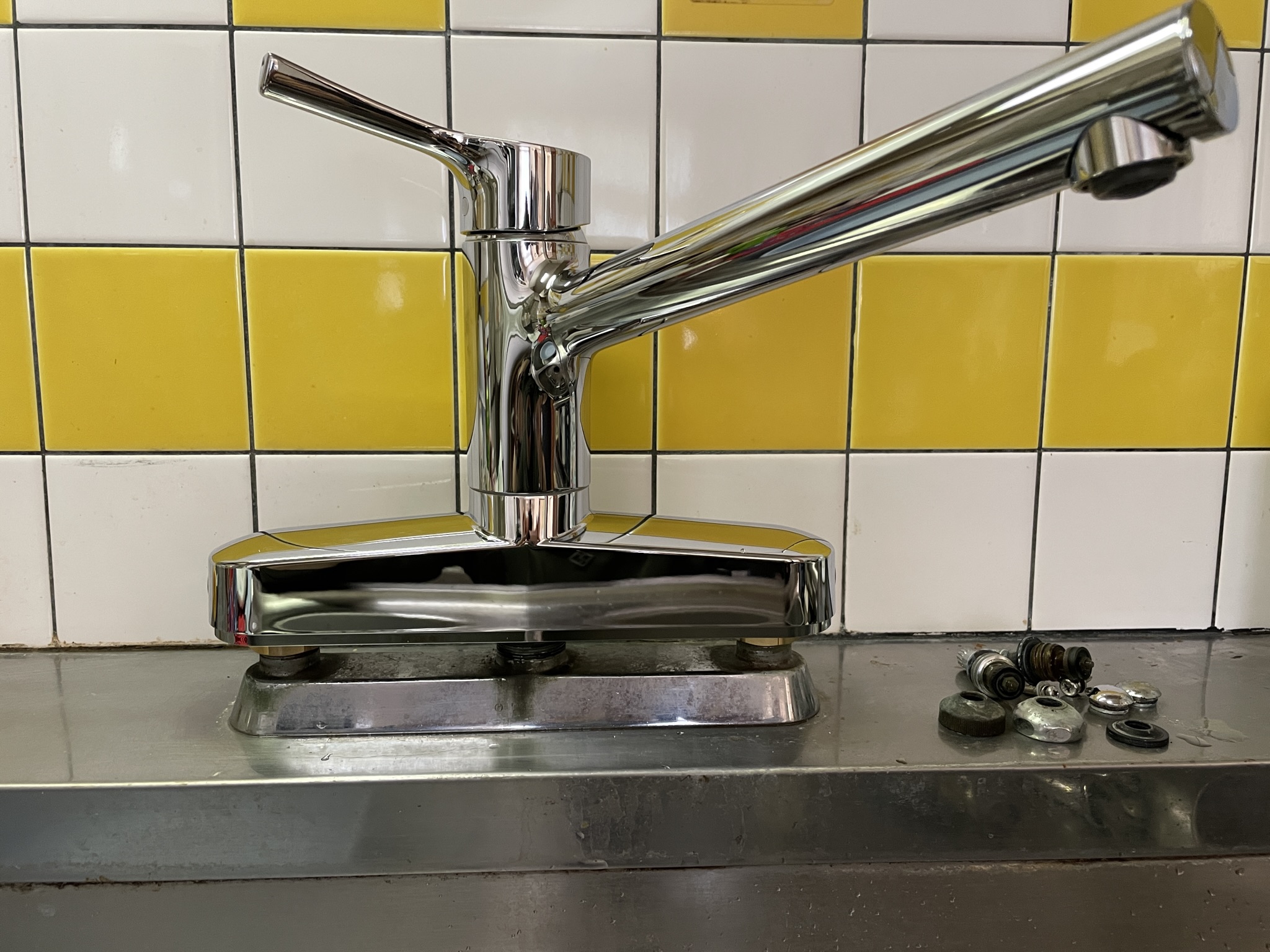 流し台の水栓をシングルレバー水栓に取替したい!とのご相談を頂きました。既設の水栓を確認すると2ハンドルタイプの台付き水栓でした。しかし、台所の下部に点検口がなく、水栓を取替するには流し台を取り外して水栓を取替するか、点検口を流し台に開けて水栓を取替するか・・の2択が多いです。 今回はTOTOの2ハンドル水栓と判断出来たため、水栓の上部のみを取替交換できる水栓を提案させて頂きました。