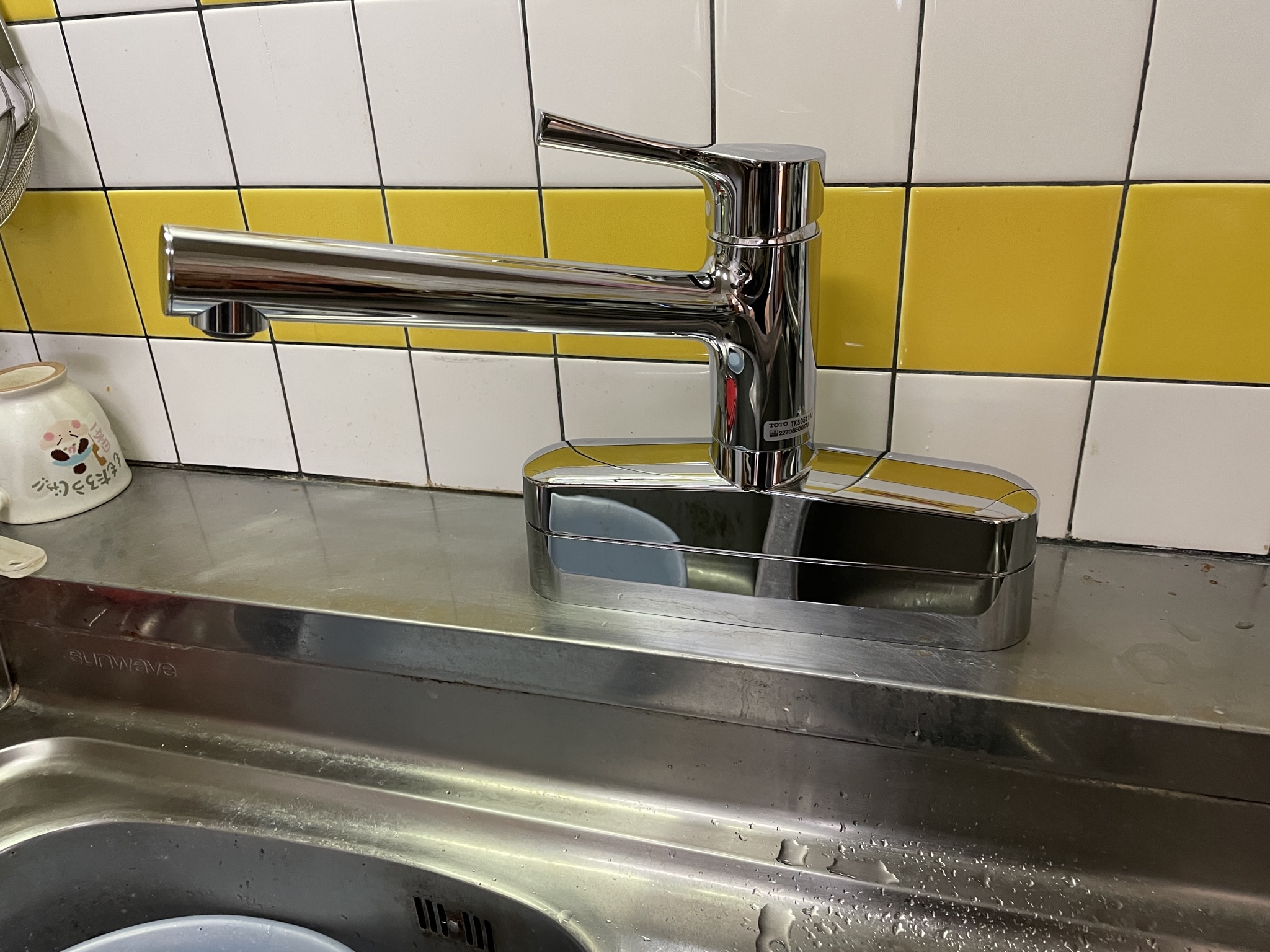 最後に化粧パネルを取付して完了です♪通常の水栓より若干高さが出てしまいますが、流し台を取り外ししたり、点検口を開けて作業したりするより費用も時間も抑えられるかなと思います。 蛇口の取替も山六設備にお任せください♪