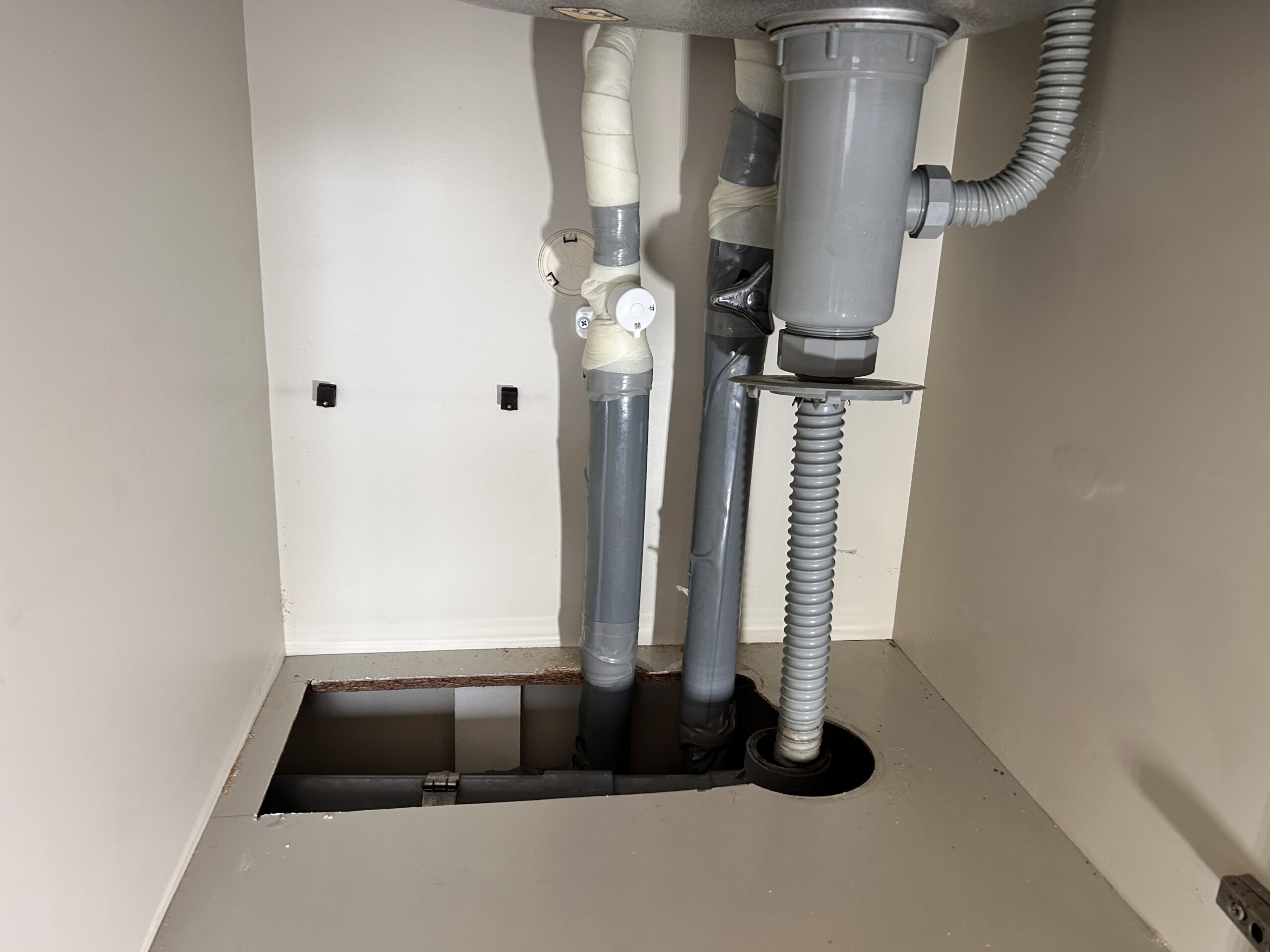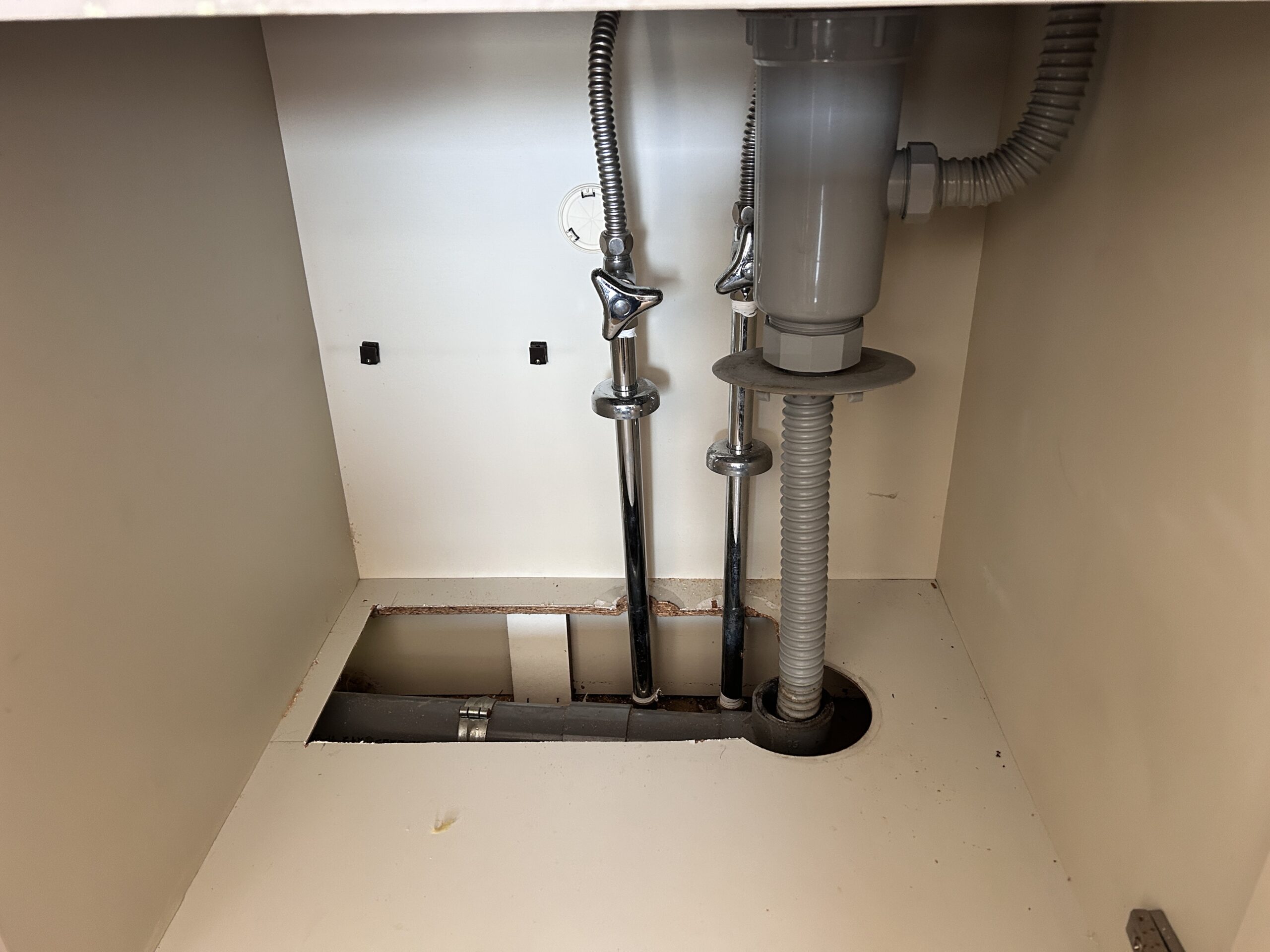 台所の床から水が漏れてくる。とご相談を頂きました。台所の底板を部分的に撤去して確認すると給湯管が凍結破損していました。
