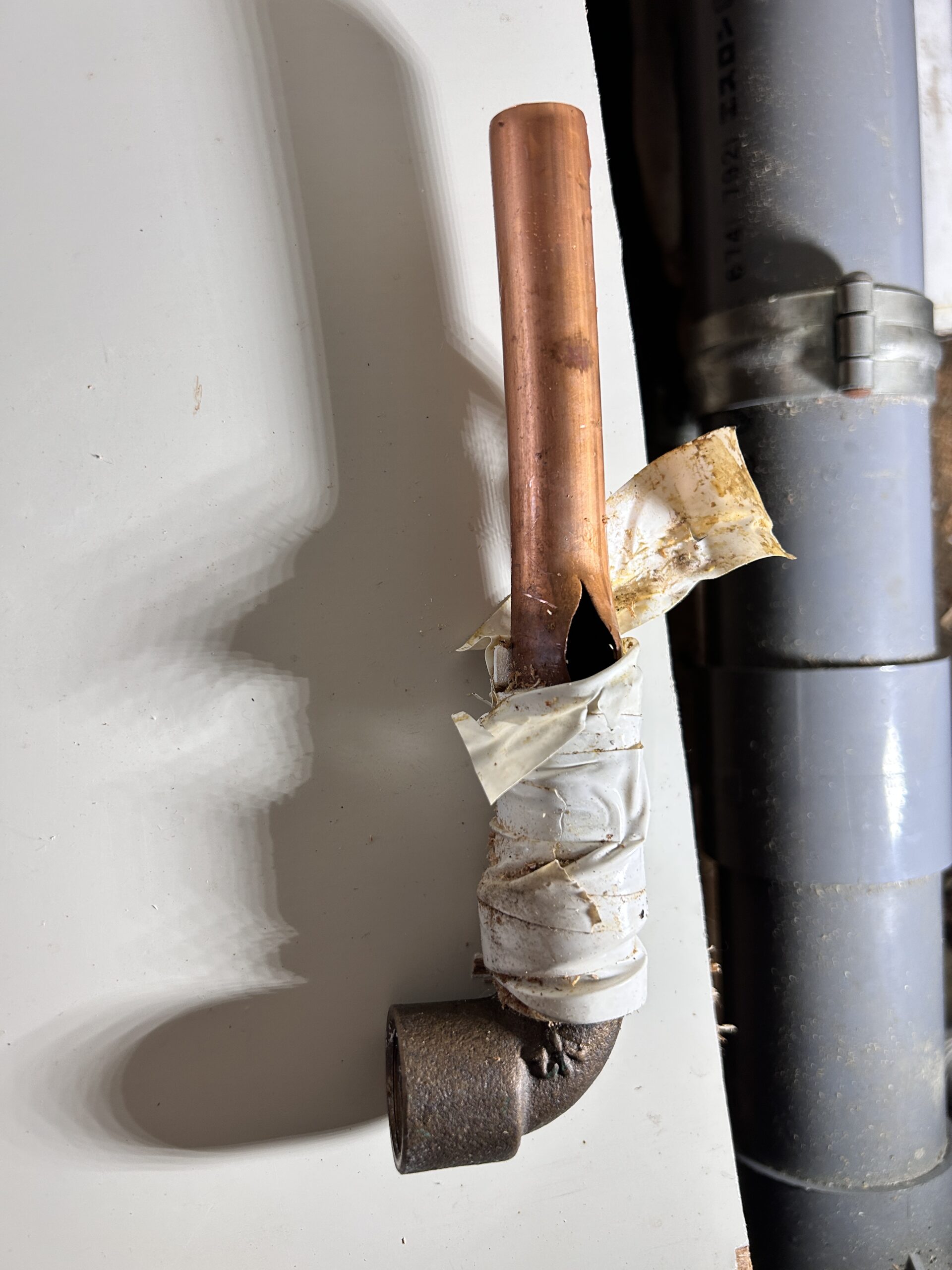 凍結破損した給湯管です。銅管ですが凍結の膨張圧力により管が破裂してしまいました。 凍結破損は銅管でも鋼管でも塩ビ管でも・・・すべての管種で起こります。 寒冷地の方は凍結対策をしっかりして下さいね! 凍結防止帯のコンセントの差し忘れや水抜きの忘れ・・など凍結の原因はヒューマンエラーも要因の一つです。