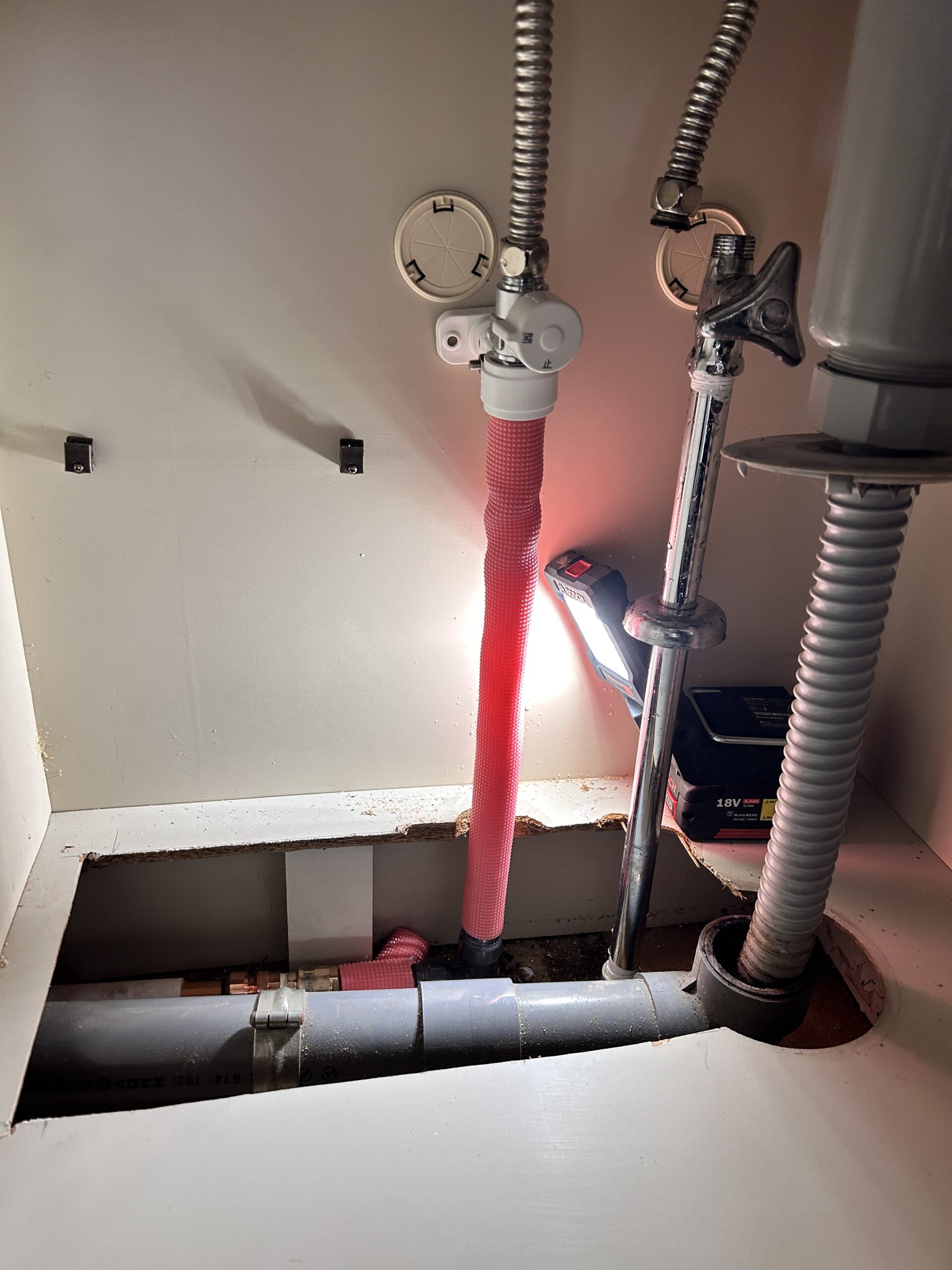 部分的に架橋ポリ管に変更して修繕。 銅管をロウ付けするスペースがない為、差し込みタイプの銅管接手を使用。 狭い箇所には簡易施工の接手等が重宝されますね♪